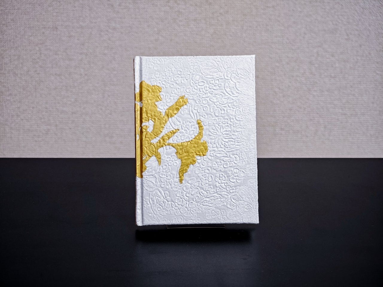 バラと小花柄のエンボスペーパーを使用した手触りがやさしいハードカバーに改装。でこぼことした触り心地が特別さを感じさせます。